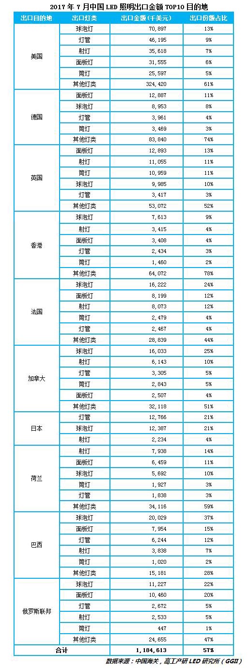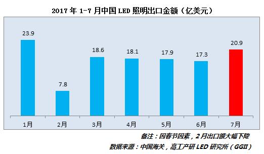 ?? GGII發(fā)布的《2016-2017年中國LED照明出口月度監(jiān)測報(bào)告》數(shù)據(jù)顯示,2017年7月中國LED照明出口總額達(dá)20.9億美元,較上月增長21%。總體來看,自前面3-6月份出口市場行情下傾以來算是一大增長的整體態(tài)勢。