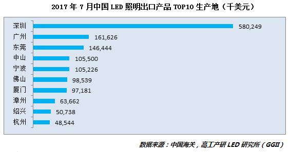 ? 從出口生產(chǎn)地來看,7月份LED照明產(chǎn)品出口生產(chǎn)地主要集中在華南地區(qū)和江浙一帶。其中,出口排名前十生產(chǎn)地區(qū)總金額約14.6億美元,占比70%。