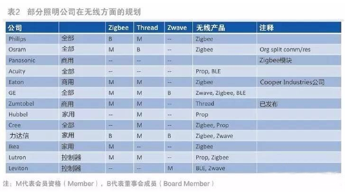 ? 如果深入其中,就會(huì)發(fā)現(xiàn)照明領(lǐng)域有許多公司(如表2)。從全球聯(lián)網(wǎng)照明產(chǎn)品發(fā)展趨勢(shì)來看,主要包括照明產(chǎn)品和控制器兩部分。表2是聯(lián)網(wǎng)照明市場(chǎng)上主要公司的信息,有些做商用照明,有些做家用照明(住宅照明),或者像Philips和Osram等是兩者都有。表2下面的兩家公司是做控制器的。 表2說明了這些領(lǐng)先聯(lián)網(wǎng)照明廠商在zigbee/Thread聯(lián)盟中扮演的角色,會(huì)員(M)在聯(lián)盟中是一般身份,而董事會(huì)成員(B)則可以指導(dǎo)聯(lián)盟的發(fā)展方向。在聯(lián)盟中,大家都關(guān)注zigbee、Thread和Zwave的發(fā)展方向,后者是美國(guó)的一種Sub-GHz協(xié)議,即低于1GHz的私有協(xié)議(注:關(guān)注Zwave主要不是因?yàn)檎彰?,而是用于家庭安?。