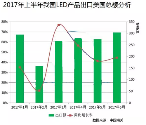 ? 從圖中可以看出,2017年上半年我國對美國出口的LED產品與去年同期相比總體呈現向上增長的態勢。上半年,我國LED照明產品的出口的同比增長18.14%,增長較為緩慢,而美國市場的同比增速明顯較高。