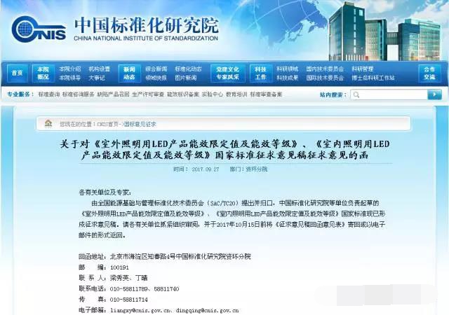 ?? 9月27日,中國標準化研究院在其網站上發(fā)布《關于對《室外照明用LED產品能效限定值及能效等級》、《室內照明用LED產品能效限定值及能效等級》國家標準征求意見稿征求意見的函》,請各有關單位抓緊組織審閱,并于2017年10月15日前將《征求意見稿回函意見表》寄回或以電子郵件的形式返回。