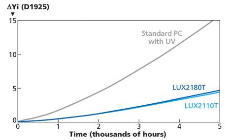 雖然PMMA對于天氣和紫外線(UV)輻射抗性方面表現(xiàn)優(yōu)于PC,但PC仍然在這些領域取得了進展。例如,SABIC的LEXAN SLX樹脂專門設計用于縮小PC和PMMA之間在戶外應用中的差距。LEXAN SLX樹脂可以抵抗由于紫外線曝光而出現(xiàn)的變黃,并且保持其光澤度、顏色穩(wěn)定性和機械性能的時間比標準PC長五倍以上。標準PC由于紫外線照射而降級,降低元件的延展性并使其變脆。圖3中的室外照明透鏡顯示了用LEXAN SLX樹脂和標準PC制成的組件在用紫外線(UV)曝光2900小時后的變黃比較。為了捕捉差異,將透鏡放置在裝有175W金屬鹵化(MH)燈的熱室中,在折射器上在120℃下放置2900小時。?