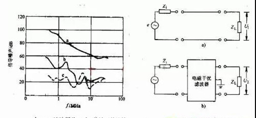設(shè)置電磁干擾濾波器加入前后傳輸?shù)截?fù)載上的噪聲電壓分別為U1和U2,計(jì)算公式是20lgU1/U2。